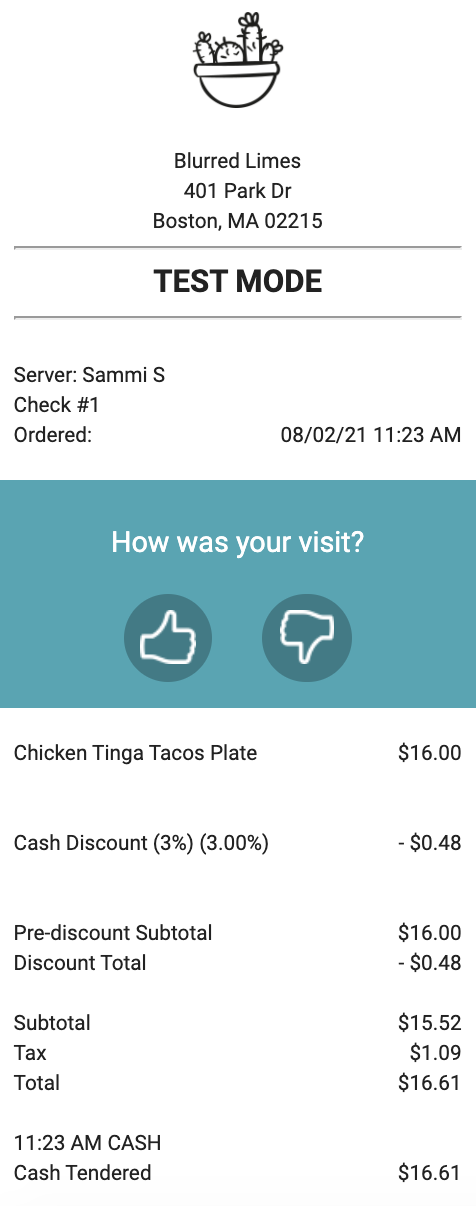 Beyond signage, merchants must have a clear, separate line item on the guests’ receipts (e.g., Cash Discount _%) that explicitly indicates that it is a discount applied for a cash payment as well as the cash discount percentage and the resulting dollar amount. The dollar amount of the discount must be shown as a negative number on the receipt to indicate that it is a discount from the advertised (menu) price. For example, a 2% cash discount on a guest’s $50 meal may have a line that reads Cash Discount (2%): -$1.00 as a line item.