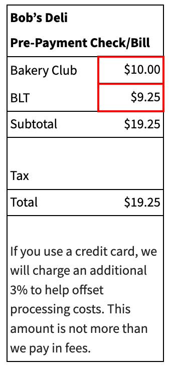 We recommend including a disclosure on your menus and menu boards stating that all listed prices include the 3% credit card surcharge, which does not apply if your guests pay with a different form of payment (e.g., debit card or cash).