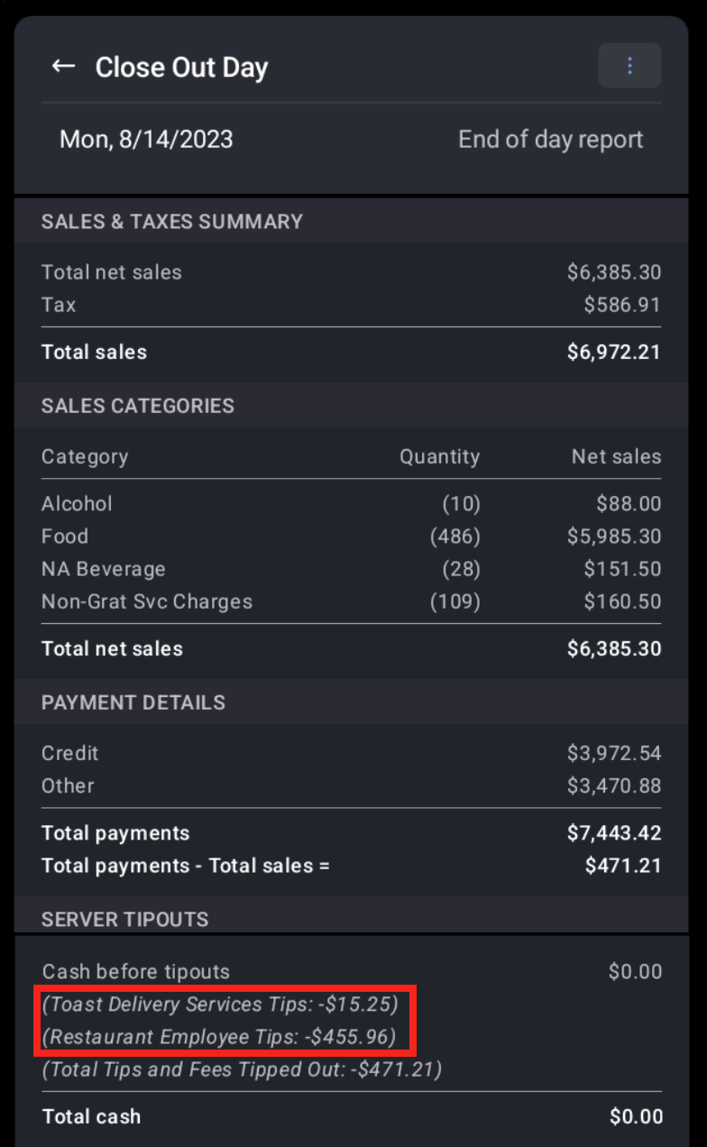 Your delivery provider collects the driver tips that guests leave on each Toast Delivery Services® (TDS) order. Toast Delivery Services tips should be deducted from Credit/Non-Cash tips before paying out your restaurant staff. Continue reading for instructions on doing this using Close Out Day on the POS or the Sales Summary and Labor Summary Report in Toast Web.