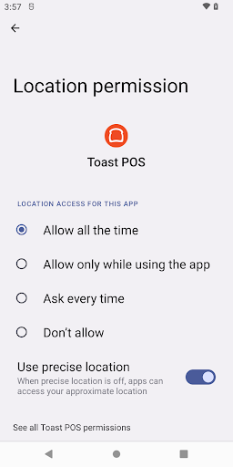 When troubleshooting issues with Toast Go® handheld, Clear Storage (as outlined below) should only be used if other, less invasive troubleshooting steps have been taken and have not resolved the issue. If Clear Storage is used, make sure to follow the necessary steps to re-enable Location and Nearby Device permissions.