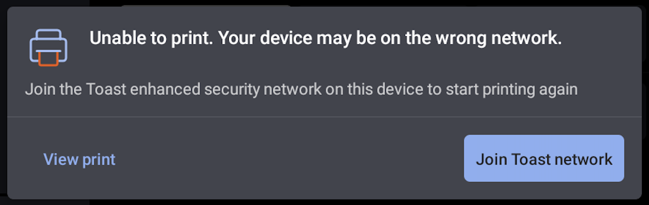This indicates that a Toast terminal connected via Wi-Fi is not connected to the _Toast network. To resolve this, select Join Toast network to automatically connect your device to the _Toast network and resume normal printing function.