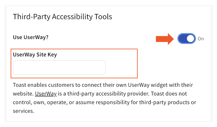 To use UserWay on Toast Websites and Online Ordering Pro, subscribe to UserWay’s accessibility widget through their page. This subscription is independent of Toast.