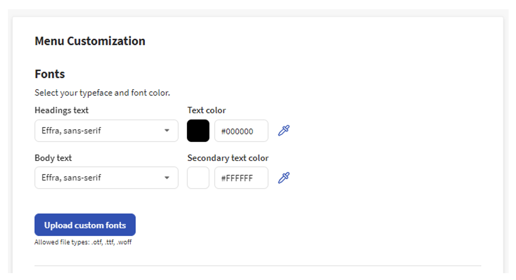 One of the benefits of Toast Online Ordering Pro is that you can configure different fonts for your site. The default upon setup for both options will be ‘Effra, sans-serif’.