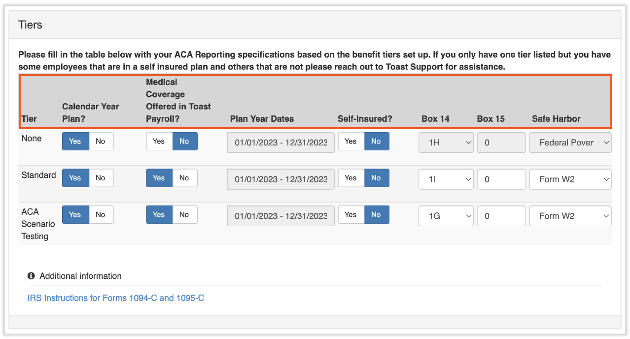 If you have used the Toast Payroll Classic Benefits module for a portion of the year, or if you began fully utilizing the module in the middle of the year, you will only need to complete the Employee Coverage Data Import for the months that you did not use the module. For example, if you started using the module in April, the report will automatically populate data from April through December. You would then manually enter any additional information for January through March.