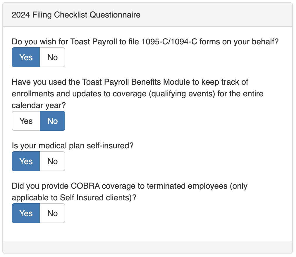 Note: This import file will contain records for employees that did not work for the entire calendar year. Please review the employees and determine if any employees were enrolled in COBRA coverage for at least one month prior to importing the report into Toast Payroll. Any former employees who you determine did not elect COBRA coverage can be removed from the file.