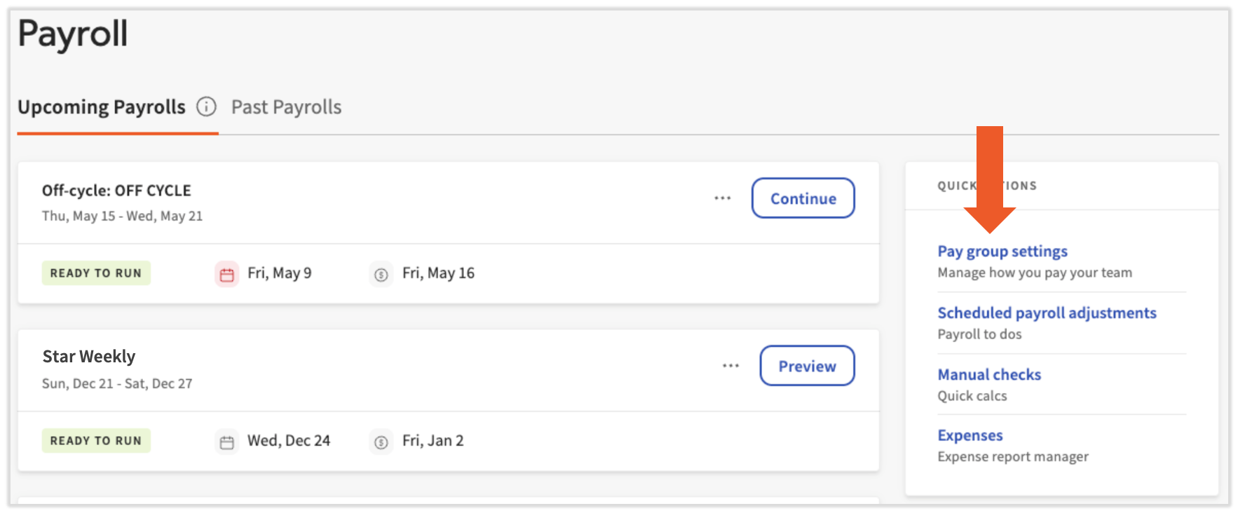 Note: If you turn on auto payroll for an eligible pay group while the payroll is open (the button on the Pay Cycle Dashboard will read Continue rather than Preview) or while the payroll has a Past due alert, auto payroll will begin with the next eligible payroll and will not be enabled for the current payroll.