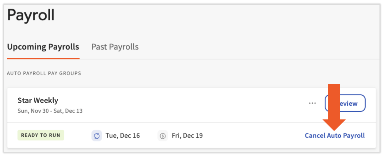 If you'd like to temporarily turn off auto payroll from an individual payroll, navigate to Payroll and select Cancel Auto Payroll for the applicable pay group. You can do this anytime before auto payroll has run. Note: Archiving a payroll will cancel auto payroll as well. If you unarchive a payroll, it will need to be processed manually.