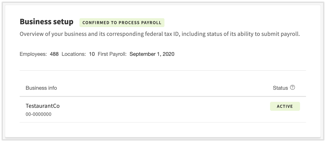 The Business Setup section offers basic information about your Toast Payroll account, including FEIN(s) in the first column. If this tile says Cannot Process Payroll, or if you see an Inactive status which should be Active, contact Toast Payroll as soon as possible. In this case, you may have also received an email stating that your business cannot process the next payroll.