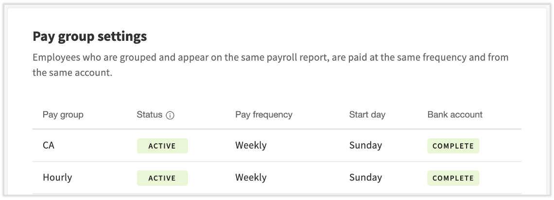 For each pay group set up within your business, you'll see a Status as well as relevant details regarding each pay group's payroll settings. If the pay group is Active, but the Bank account column displays Missing Signature or Missing Account, this could cause issues when it comes to processing payments for your employees. To correct this, start a chat with us by selecting the blue chat dot in the lower-right corner of any Toast Payroll page.