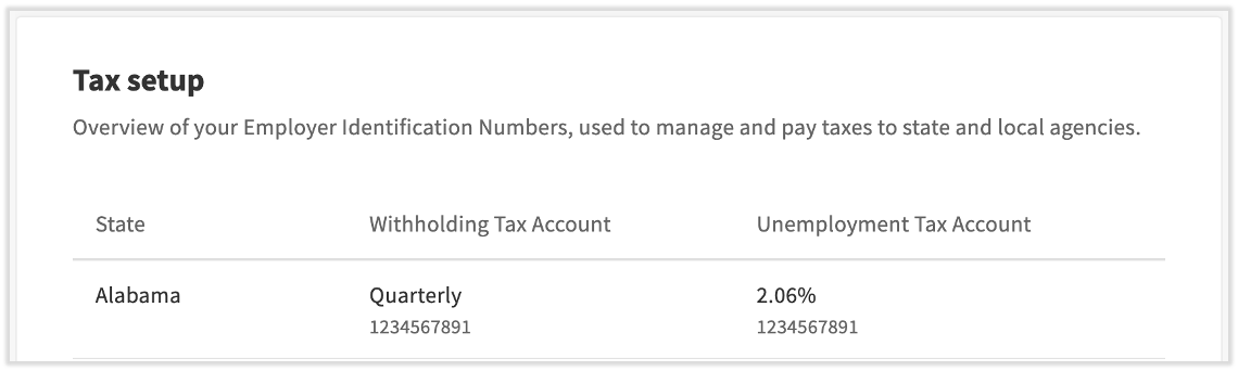 All 50 states require an unemployment tax account, an unemployment tax rate, and a tax payment frequency. Some states also require a withholding tax account, but those that do not are indicated by N/A in the charts on this page. When you receive notices that these rates or frequency details have changed, be sure to forward those to us via the blue chat dot in the lower-right corner of any Toast Payroll page so we can stay current for your payroll processing.