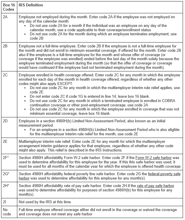 While each field of the form is requesting a specific piece of information, when completing Form 1095-C, it can also be important to consider how the different fields may relate to one another. In Form 1095-C, the IRS provides two separate sets of codes for Boxes 14 and 16, respectively. Employers can then reference these ACA codes to report to the IRS the scenarios and situations surrounding what minimum essential coverage looked like for a specific employee.