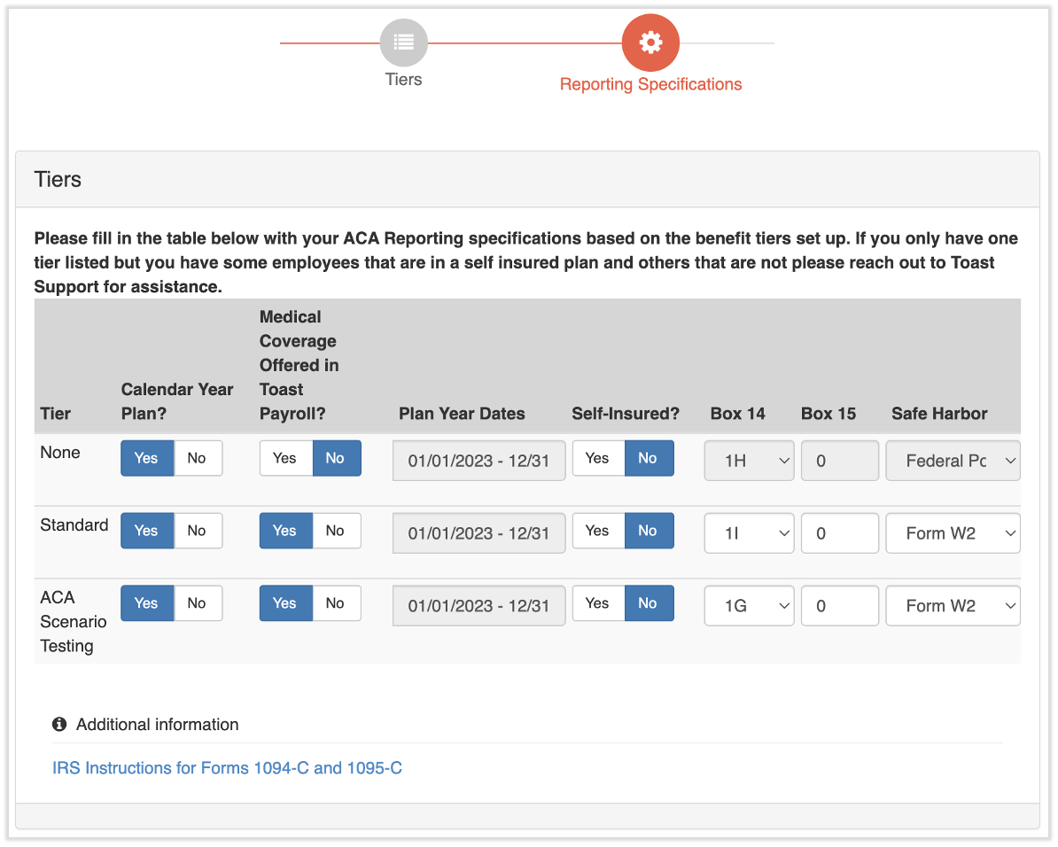 For employers who have utilized the Toast benefit module for the entire year, the Toast system provides a Specification Tool to assist employers by automatically generating and populating Box 14 codes for each employee based on the information the employer has entered into the Toast system. The employer is then able to review the codes generated for each employee for accuracy before instructing Toast to submit ACA filings on their behalf.