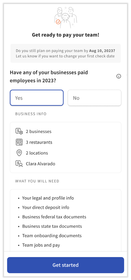 Once you're in Toast Payroll, you'll see a pop-up on the right side of your screen. Toggle Yes/No (not usually necessary) and select Get started.