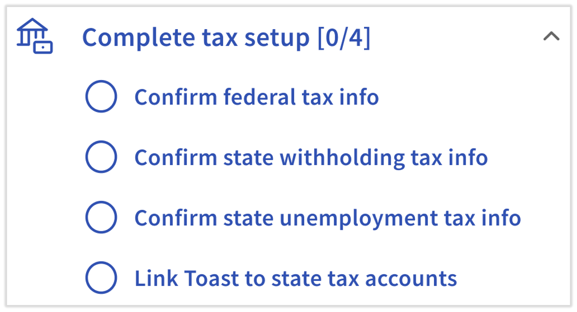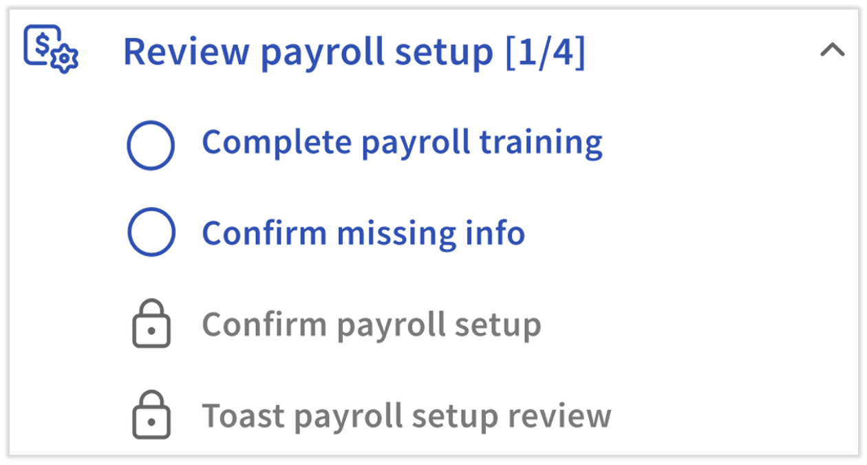 Note: If you close this checklist at any time, you can reopen it by selecting the checklist icon in the upper-right corner of the Toast Payroll dashboard.
