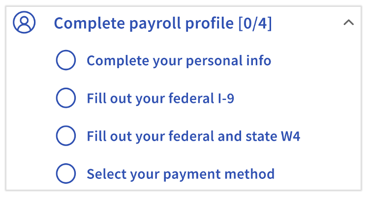 Complete payroll profile: The first section here prompts you to complete several tasks on your payroll profile. Select each of the four tasks to be taken to the appropriate place to complete them. The most important data we need from every staff member includes: