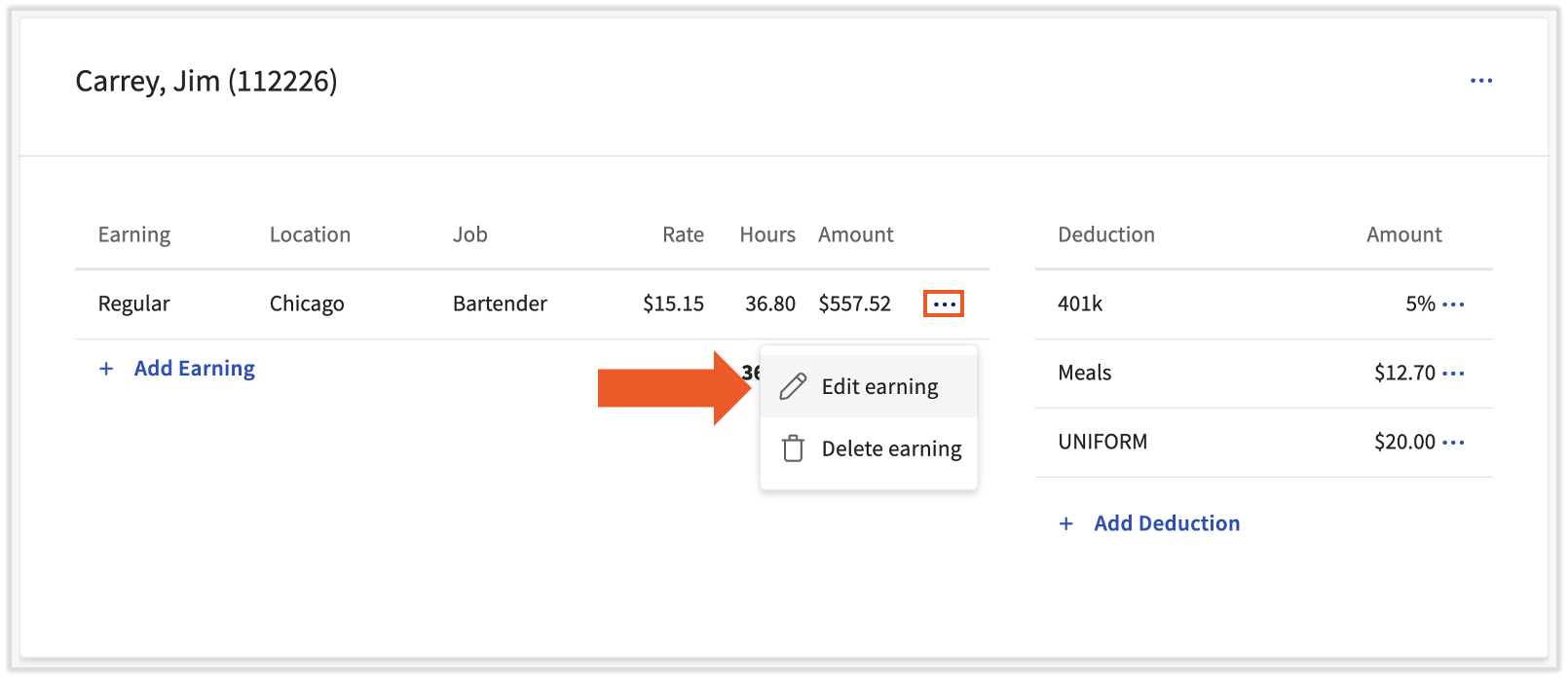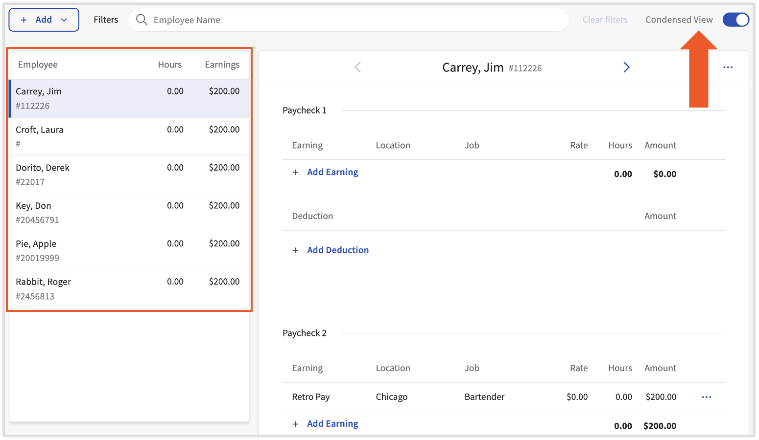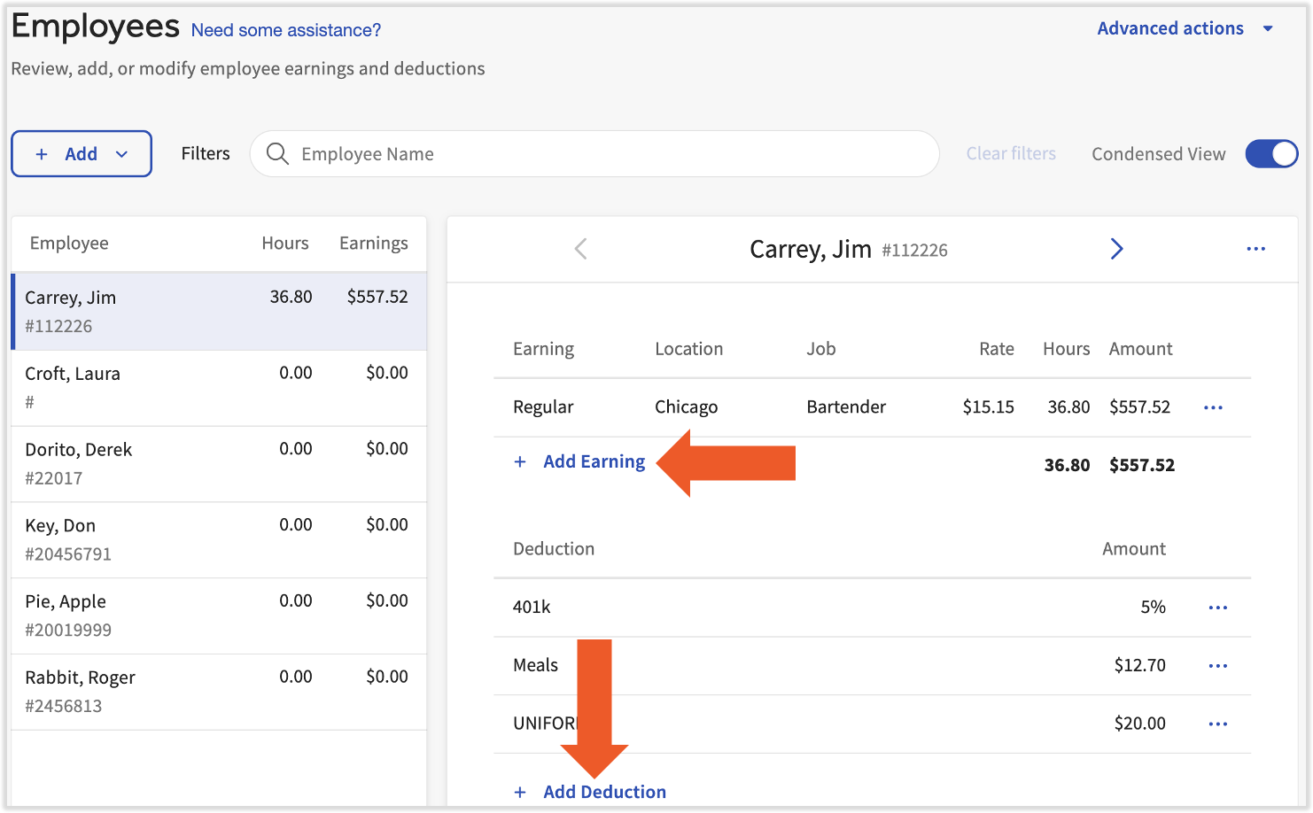 There are two views on the Employee Earnings step: Detailed and Condensed.