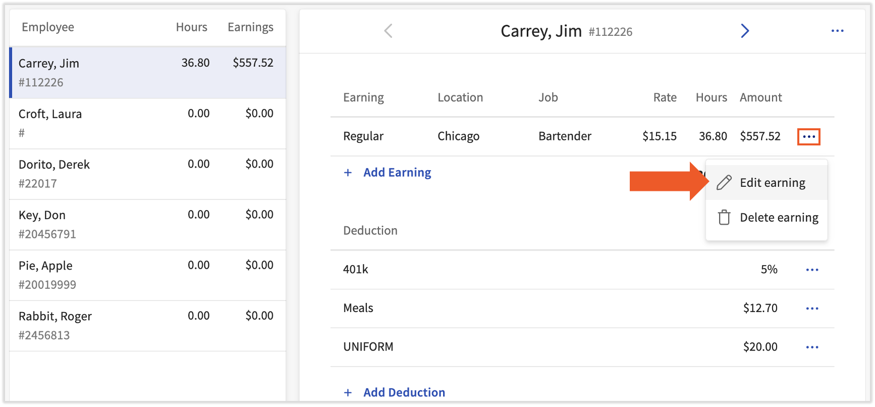 When processing payroll, one-time changes to payroll can be made from the Employee Earnings step. Changes made on the Employee Earnings step will not carry over to the employee's record going forward; the changes will only affect the current payroll.