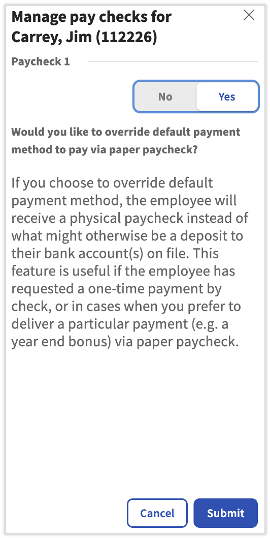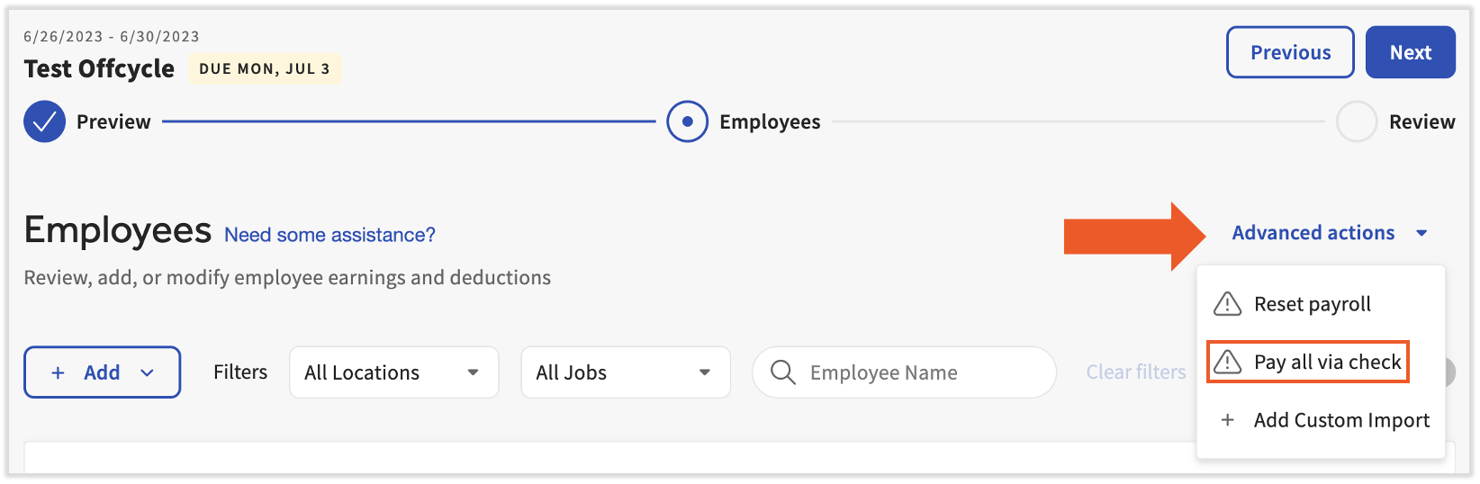 You can also force live (paper) checks for all employees on this payroll. Select the Advanced actions menu and choose Pay all via check. This is most common for .