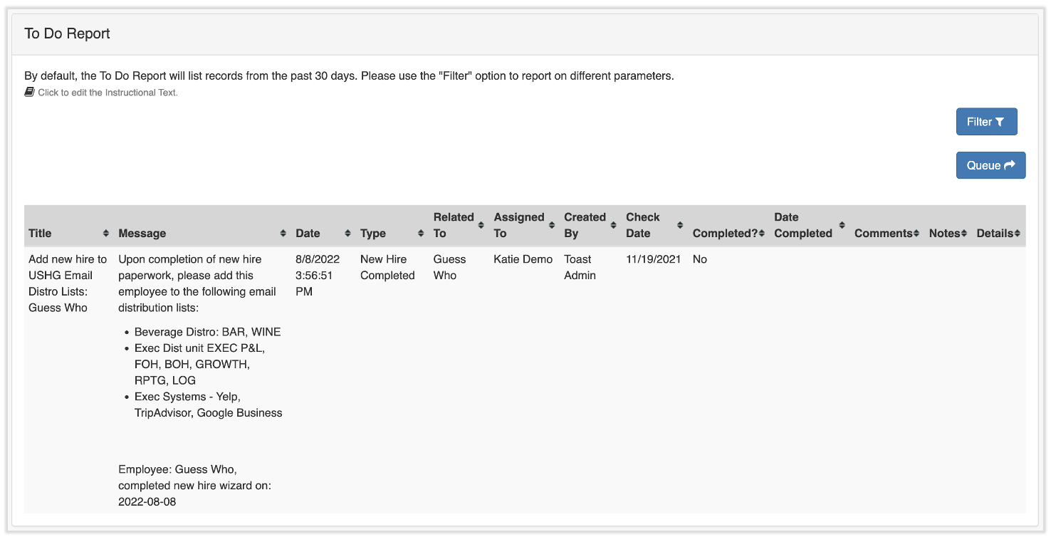 This page automatically filters to the past 30 days. Use the Filter button to change dates/look for specific to do's. Use the Queue button to export the data to a .CSV file.