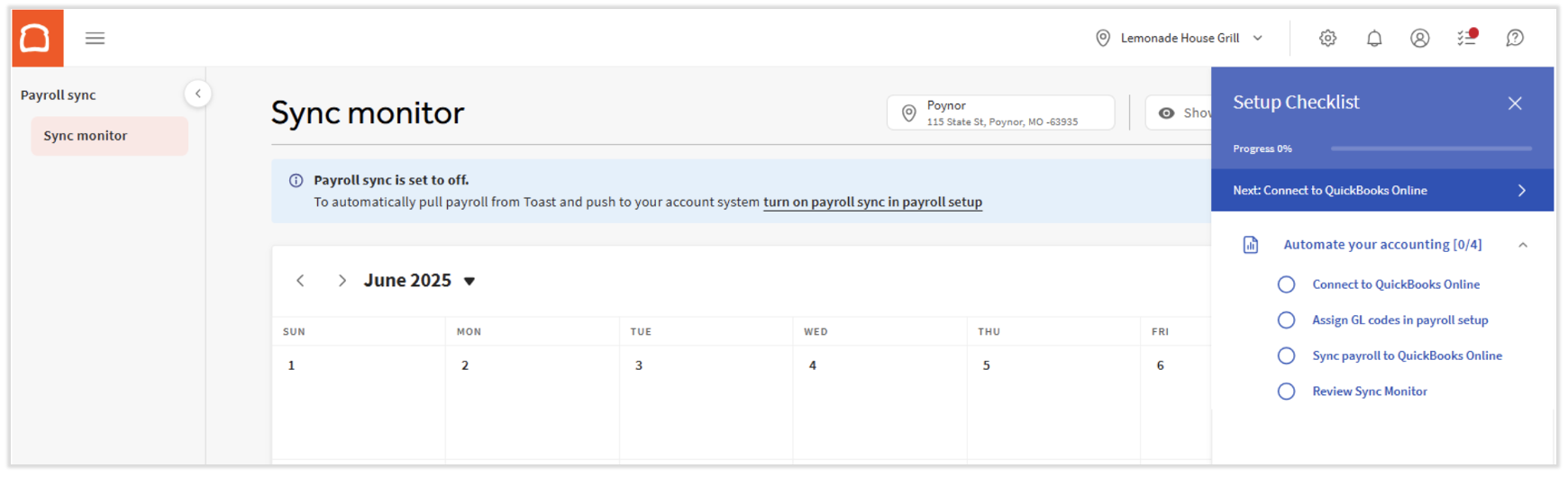 Once each step above is complete, the Setup Checklist will no longer appear on this page and Toast Payroll will automatically create payroll journal entries according to the framework you established. To return to the Sync Monitor when using the Toast Payroll and QuickBooks Online integration, select Connect to QuickBooks after each submitted payroll. Otherwise, navigate to Payroll > Past Payrolls > View > Connect to QuickBooks.