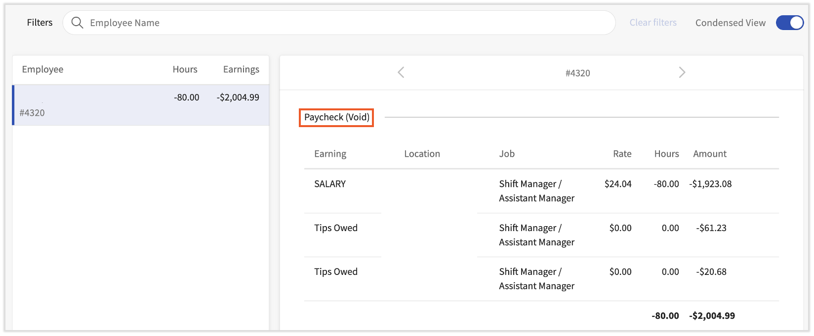 A void in Toast Payroll cancels a payroll record and reverses the payroll data of the original transaction from the employee, therefore decreasing any associated earnings, taxes, and deductions. A voided transaction also prevents this record from being included on the employee's Form W-2. Voided paychecks are processed within one business day.