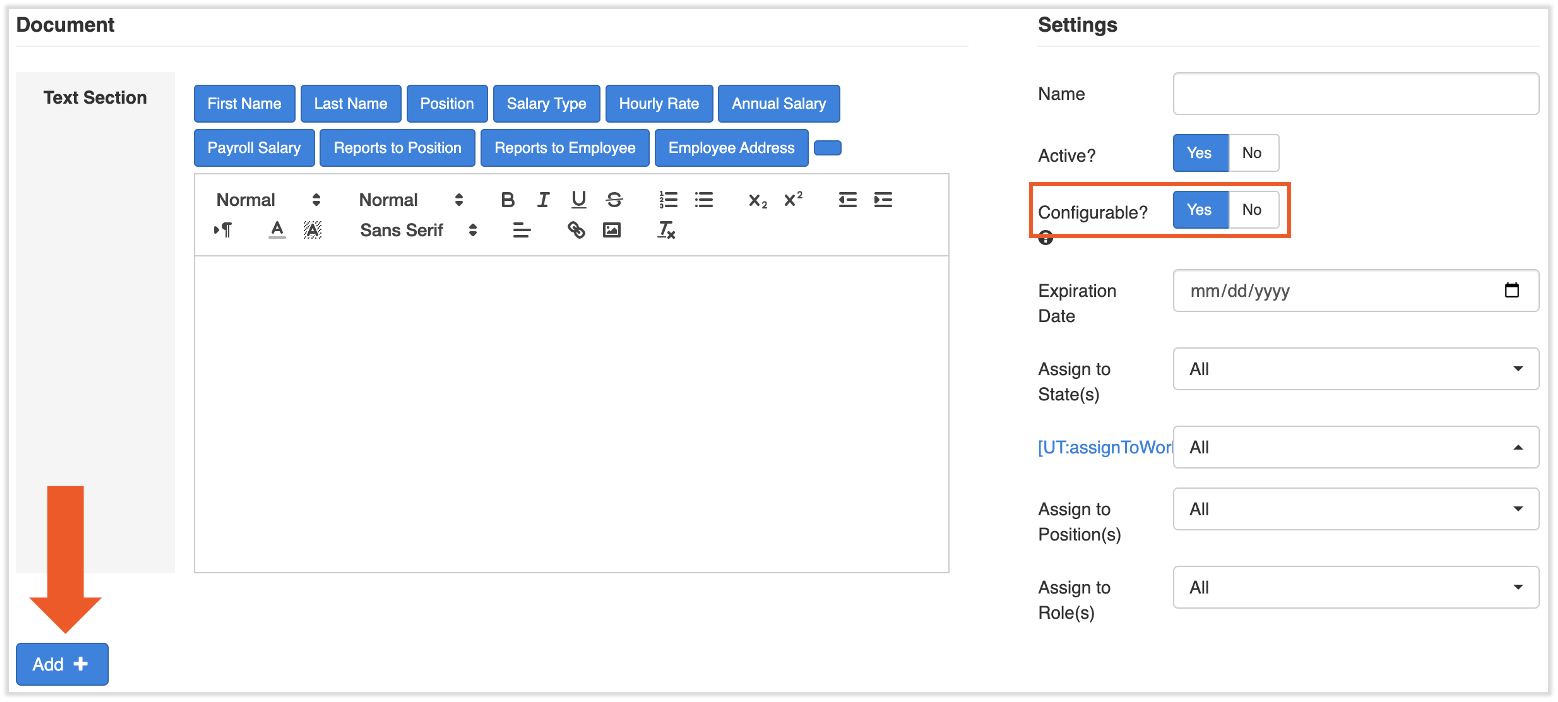In Toast Payroll, there are two types of documents you may want new hires to sign during their onboarding process: a non-editable PDF (one you upload) or a configurable document (one you create directly in Toast Payroll). Both of these may be assigned to new hires grouped by specific locations, positions, or security roles.