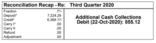 Your overall tax variance can be found in the top right-hand corner of the second page of the quarterly tax package. All tax variances (credits or debits) will hit your account mid-month (roughly between the 19th and 25th) that follows the end of the quarter.