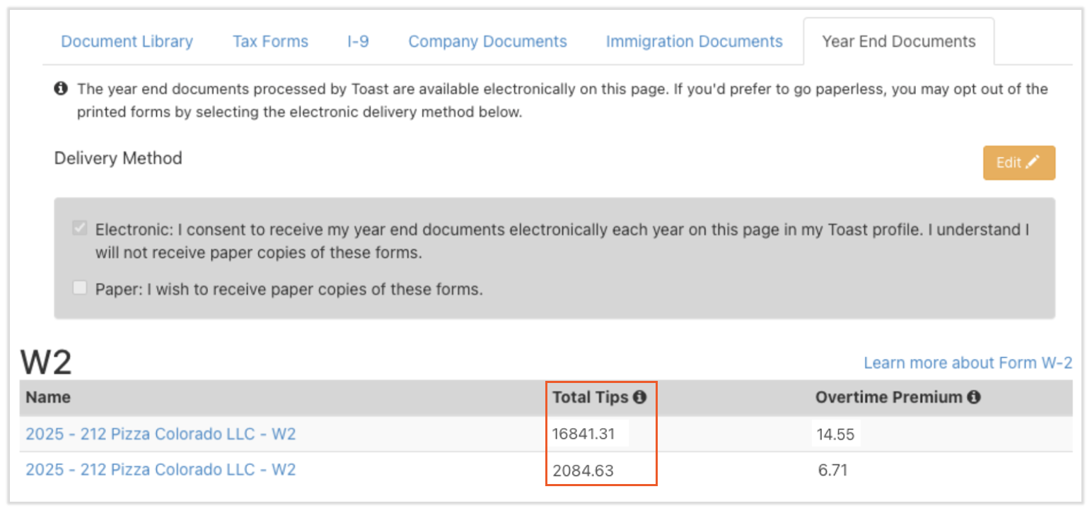Employees can and navigate to My Profile > Taxes & Documents > Year End Documents. Toast Payroll's calculated overtime premium amount will be listed next to each applicable 2025 Form W-2 on this page beginning on January 19, 2026, when Form W-2s are available. The overtime premium amount is not required to be reported on the 2025 Form W-2.