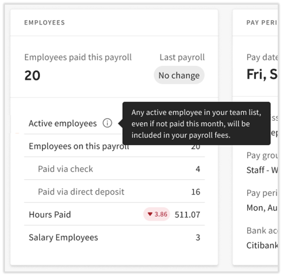 NEW! For every payroll run that includes the first check date of the month, Toast Payroll has added the number of active employees to each payroll run and out of those, the number of employees who are not being paid on each payroll run. We will also display your monthly SaaS fees (based on the number of active employees in your database) and the associated sales tax.