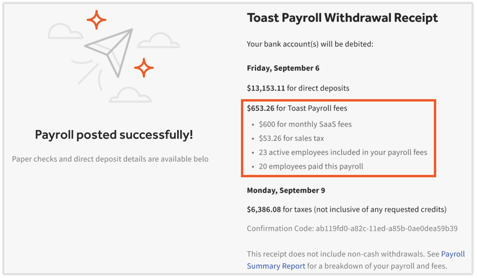 NEW! After you've selected the Submit Payroll button, you'll land on the Confirmation page. Within your Withdrawal Receipt, Toast Payroll added the amount of total fees. This includes a breakdown of your monthly SaaS fees (based on the number of active employees in your database) and the included sales tax. For reference, we include the same number of active employees and number of active employees who weren't paid on this payroll run here too. As a reminder, this data will only appear on the payroll runs which include the first check date of each month.