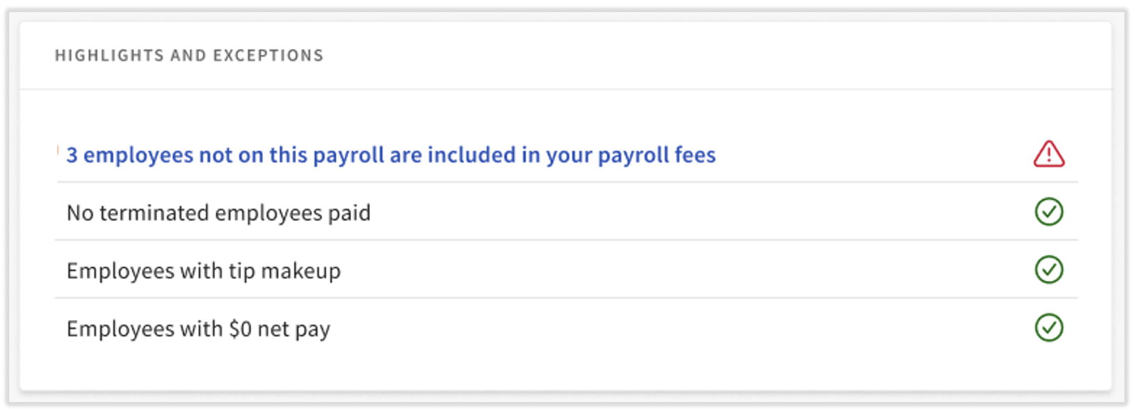 This guide begins on the Review and Submit step, the third step of payroll. The number of active employees will be in the Employees tile and, if applicable, a notification about the number of employees who aren't being paid will appear in the Highlights and Exceptions tile (select the link to see the employees). Use these numbers to manage your invoicing and the number of active employees in your database; make a when necessary. An example of each tile appears below.