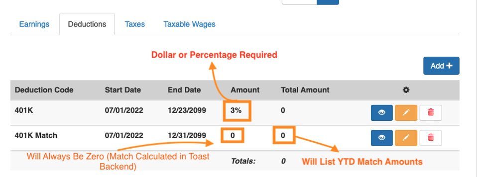 Toast Payroll customers can sponsor, set up, and process customer employees' retirement elections and deferrals, and manage employer match contributions through Toast Payroll by virtue of Toast Payroll's integration and partnership with Vestwell Retirement. All Toast Payroll customers, regardless of payroll package, are eligible to support retirement-related deductions or to set up a per-pay-period employer match in Toast Payroll.