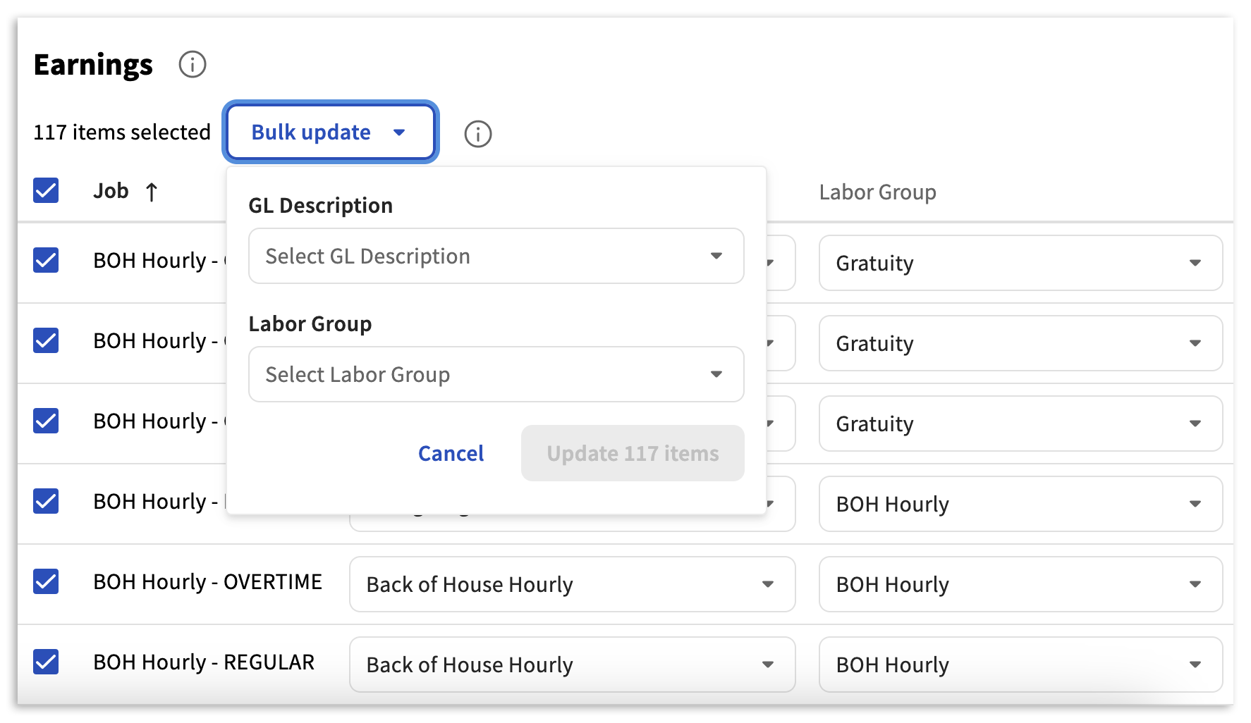 These are a way to categorize different jobs or expense types within your payroll. For example, all your front of house hourly jobs (i.e. server, cashier, bartender) might fall into the FOH Hourly labor group. Whereas your back of house hourly jobs (line cook, prep cook, dishwasher) might be assigned to the BOH Hourly labor group.