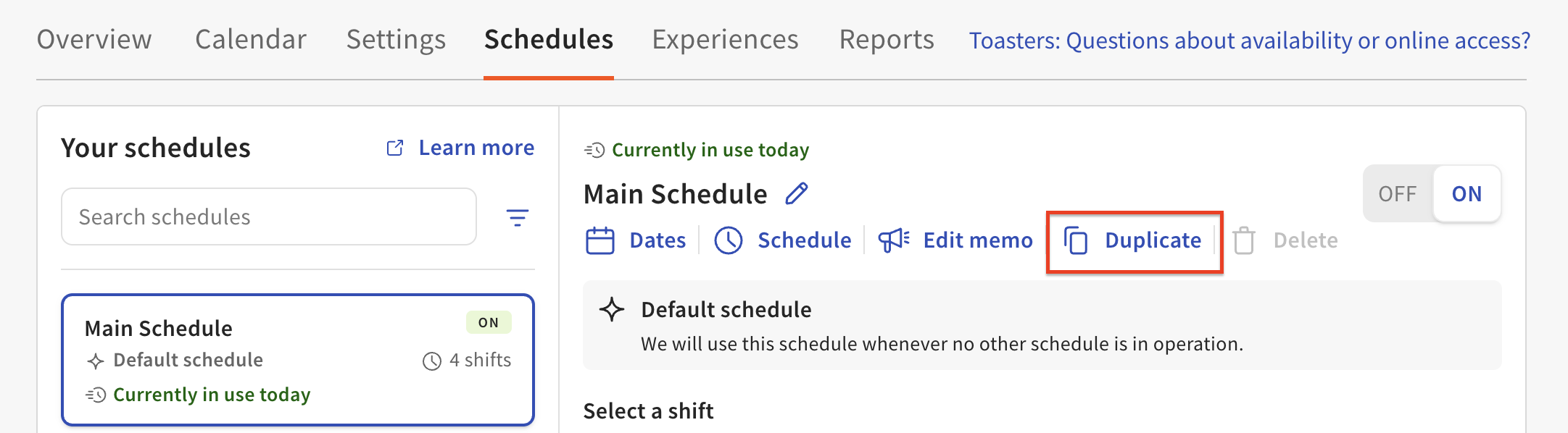 If your special dates have settings that are similar to your regular schedule, you can use the duplicate feature to create a template of the regular schedule, now with the inclusion of your special, scheduled dates. This duplicated template can now be edited independently from your regular hours as a brand new schedule. This is best used when adjusting seasonal hours with a range of dates, but similar operating settings.