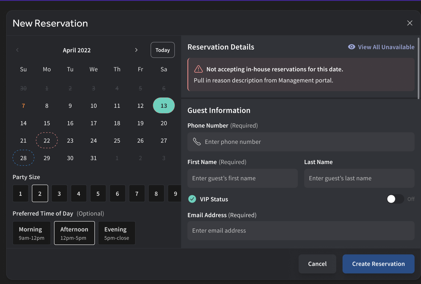 The blocked date will also be shown in the Toast Tables™ app to let hosts know your restaurant is not taking in-house reservations for that given date, as shown in the example below.
