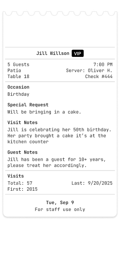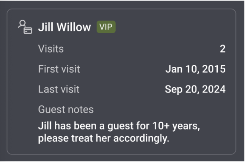 By integrating directly to your Guestbook, digital chits allow your staff access to key guest details such as: