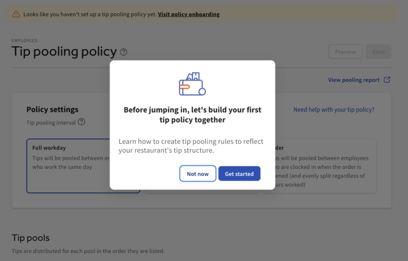 If you save a tip rule, either on the tip pooling page or by completing and saving the wizard, you are no longer eligible to use the tool, so take your time with understanding each step and how it affects the tip rule you create here. If you need additional help or would like to follow along as you complete the wizard, refer to .