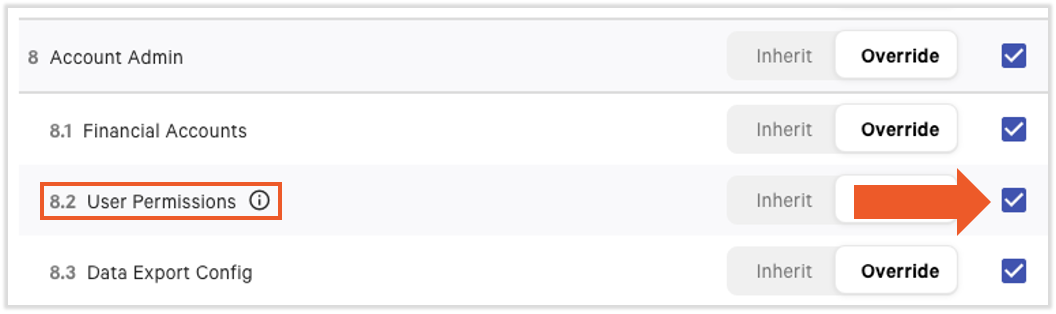 Permissions inherited from job roles will appear as selected but greyed out in the system (gray checkboxes). This visual cue indicates that the permissions are linked to the employee's role and cannot be altered unless overridden. Permissions should be inherited when: