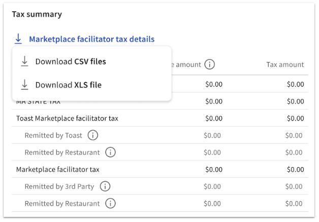 You may also export a report that provides transaction-level tax information for all orders where Toast is classified as a marketplace facilitator.