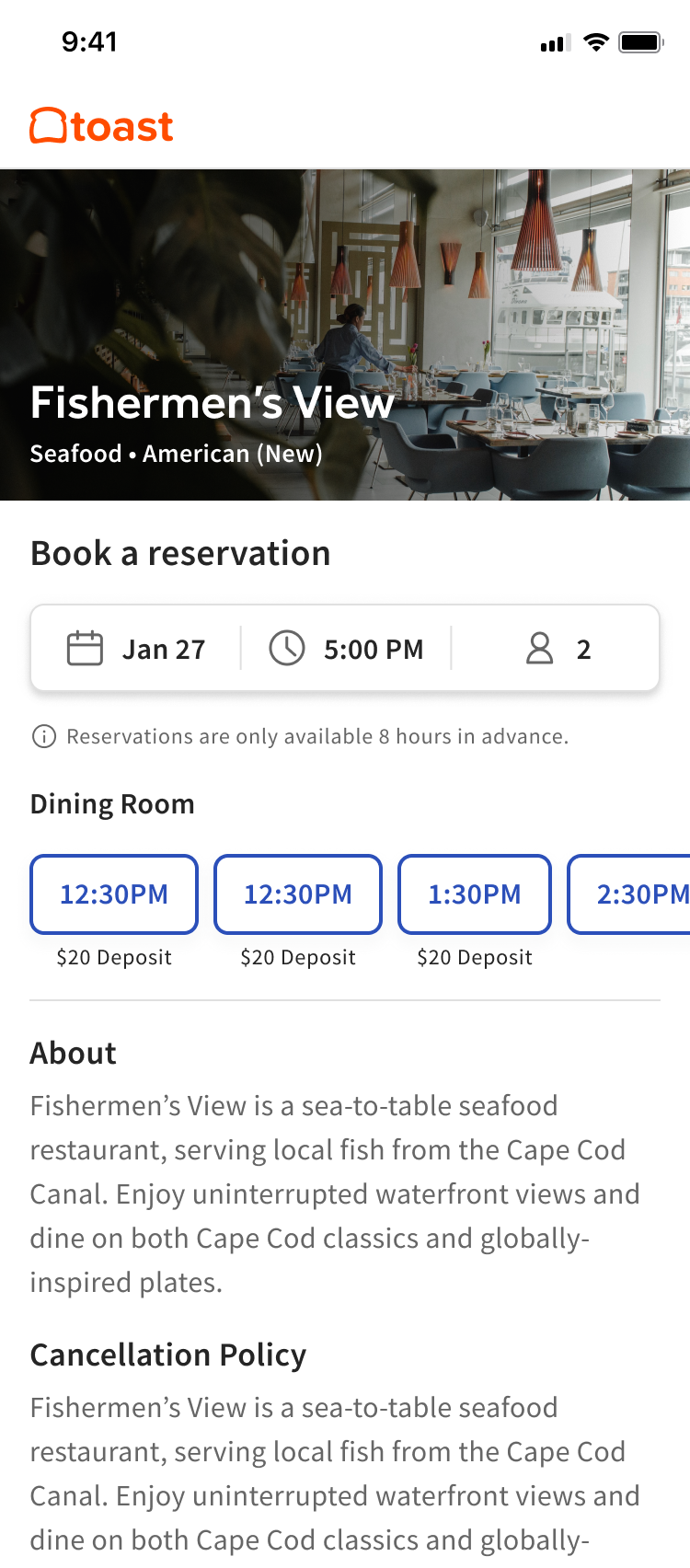 When guests are searching for an online reservation and they encounter a time slot that requires a deposit or prepayment, they'll be prompted to pay the deposit or prepayment before they can receive a reservation confirmation. Toast Tables will hold their time slot for 10 minutes as they complete their deposit or prepayment payment details. Guests will see your automated policy as well as any additional policy you've created.