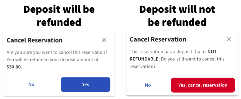 If a guest chooses to cancel a reservation that required a deposit or prepayment, they'll see one of the following warnings messages below, informing them whether their refund will be deposited before they confirm their cancellation: