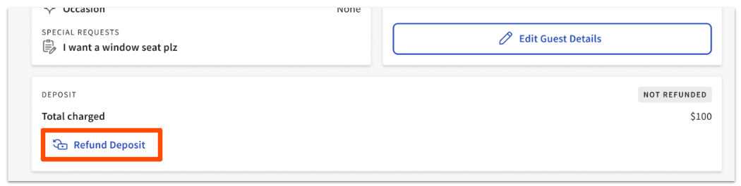 To manually refund a guest's deposit before seating, navigate to the Overview tab of the Waitlist & Reservations page, and select the booking from the View reservations table. Select Refund Deposit.