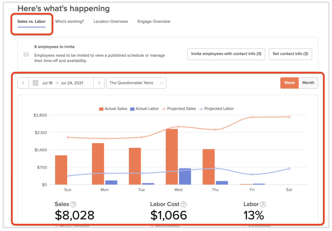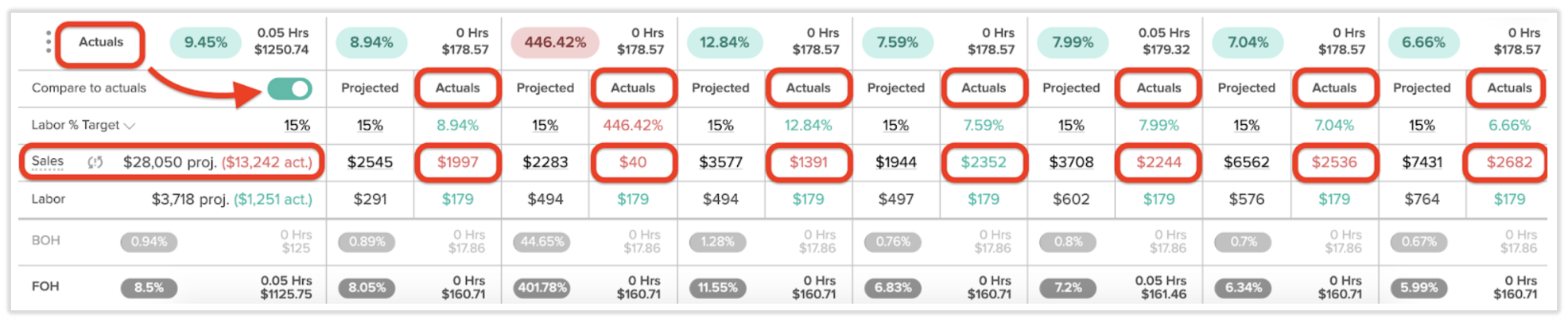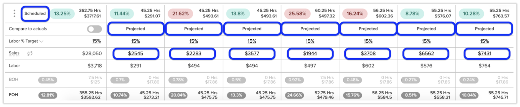 Actual sales: Actual (net) sales data for the current and future days will initially be empty until sales data is received. Once the sales numbers are synced from the POS, they will appear under the corresponding days within 7shifts.