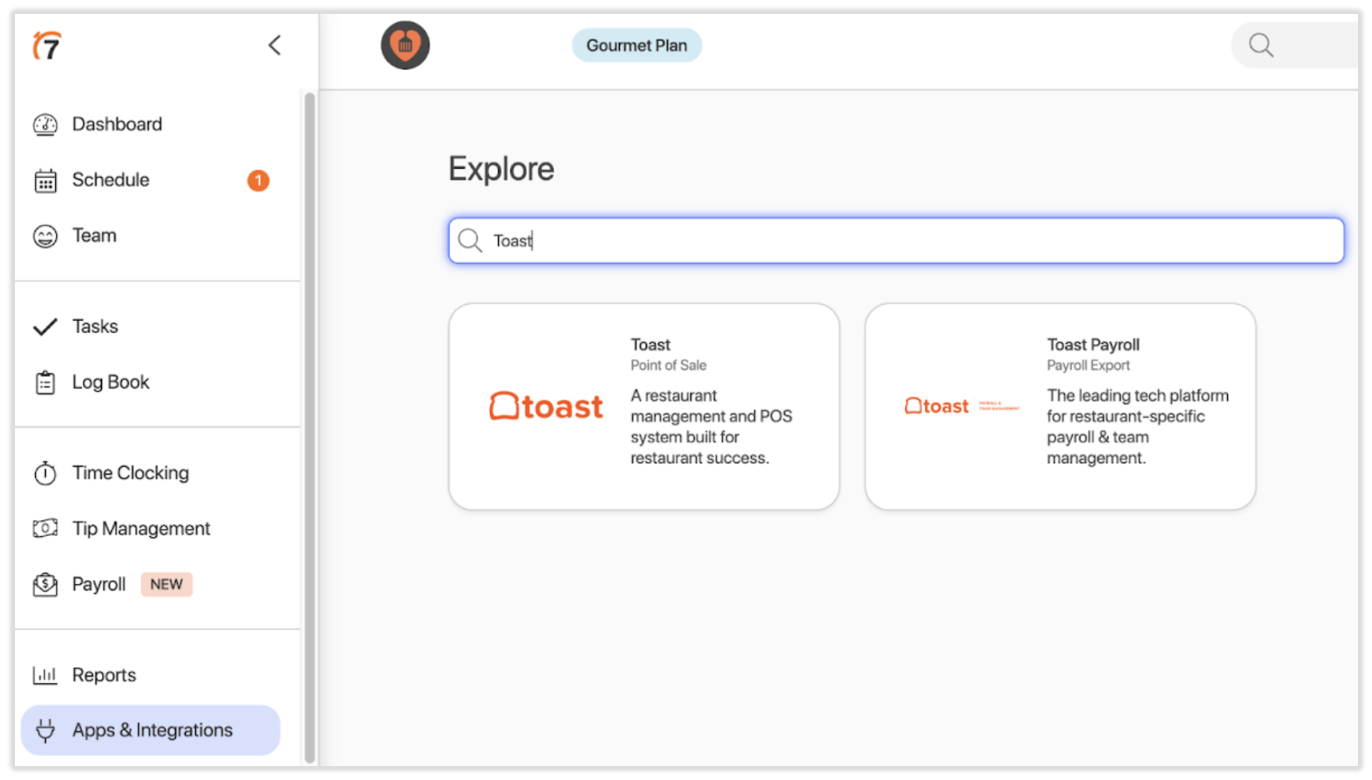 To enable the integration of 7shifts with Toast, you must start in your 7shifts account. Then, you must add the 7shifts integration in Toast Web using Toast Partner Integrations.