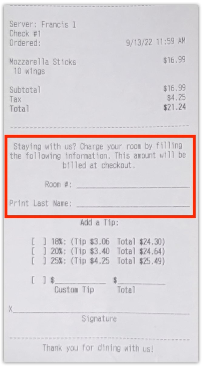 Changes to a location’s receipt setup allow guests to provide their hotel information directly on their printed receipt, so servers and restaurant administrators can update their hotel information. This information will most likely include the guest's name, hotel room, and signature.