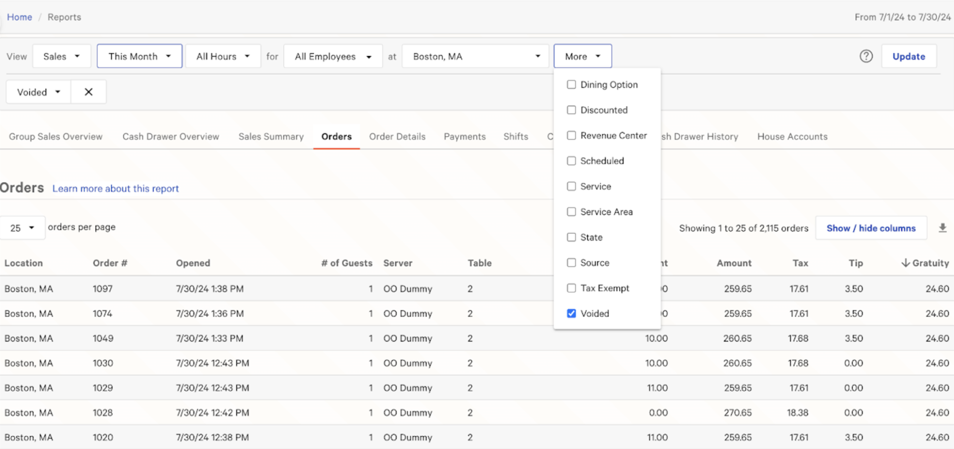 The Toast Sales Summary will no longer include the voided Uber Eats and DoorDash orders in net sales, and the voided payment will no longer appear in Toast since no payment is collected. The Orders report and Order Details report will show any voided Uber Eats and DoorDash orders as voided as seen below.