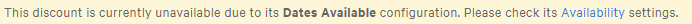 If the issue isn't resolved and the availability dates for the discount are blank, you can try adding a currently active start and end date.
