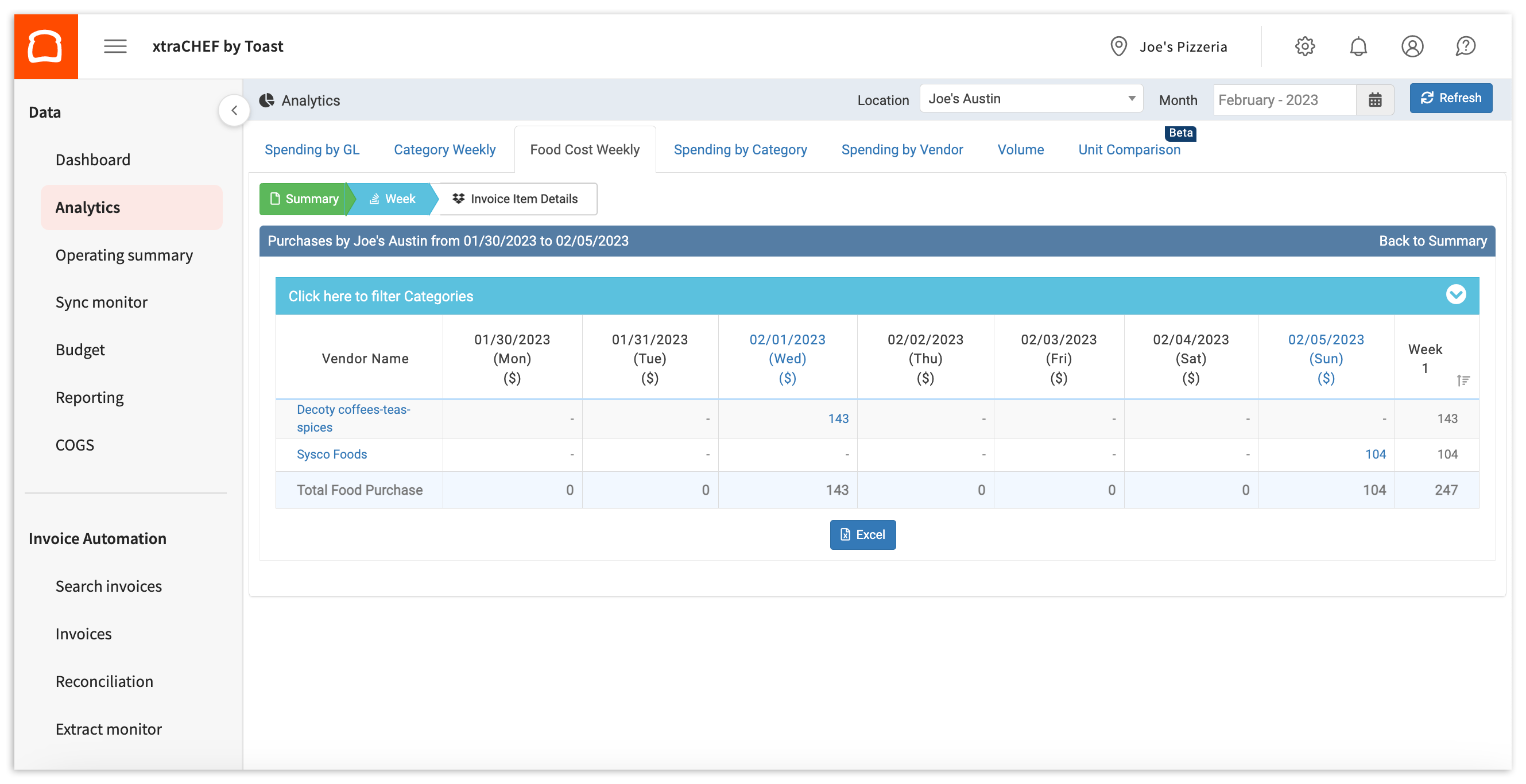 To locate your Food Cost Weekly page, navigate to Analytics > Food Cost Weekly.