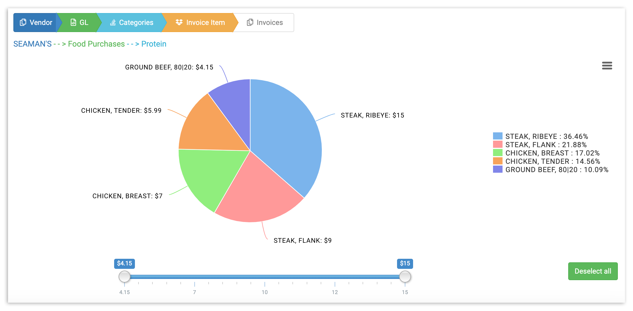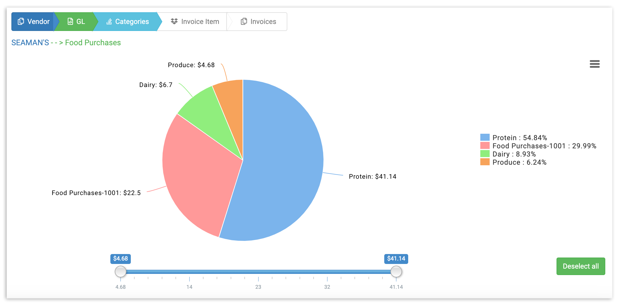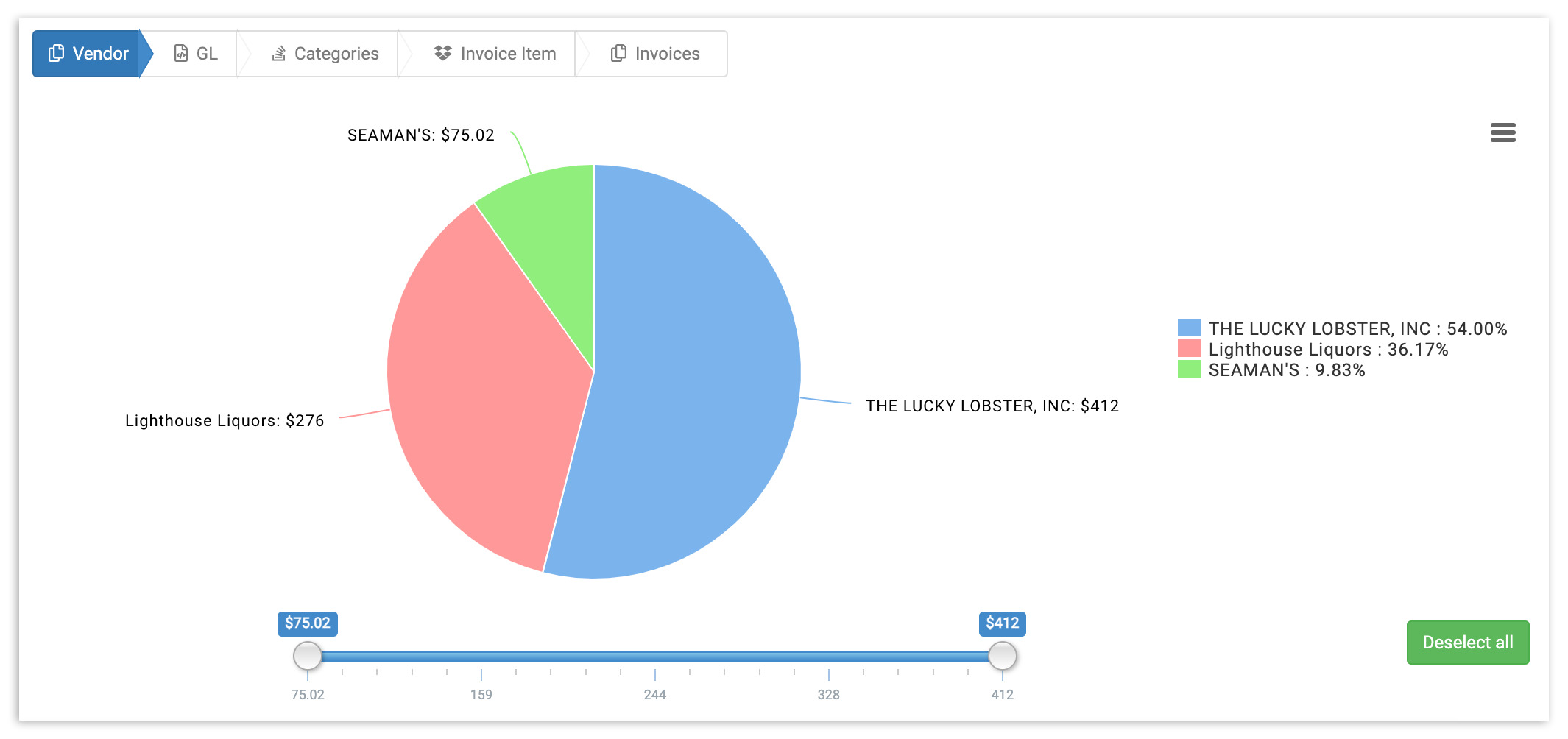 You can also toggle with the Amount Section Slider to adjust the slider to include only vendors who fall within a specific price range. Any vendor whose total invoice amount falls above or below the parameters you decide will automatically be excluded from the pie chart, allowing you to drill down on key spending areas.