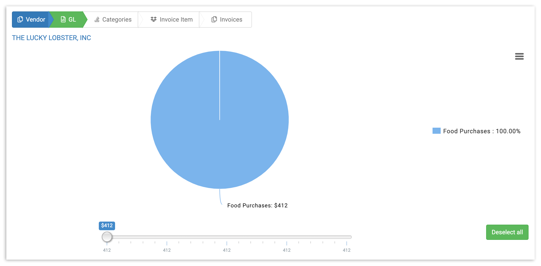 As with the Vendor List view, in GL view, you can customize your data by selecting or deselecting GL codes and adjusting your price range to get a narrower view of certain spending areas.